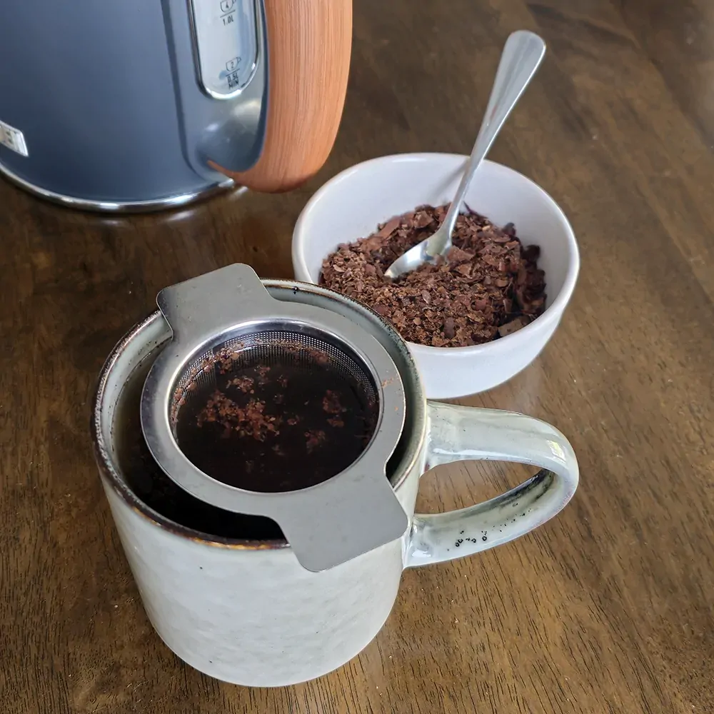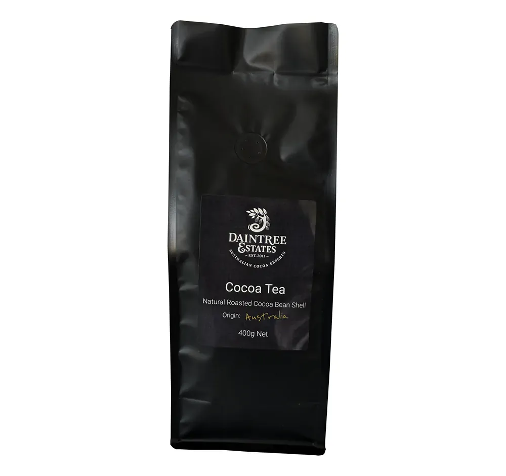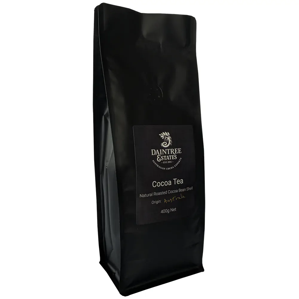 Pro Tip! Grind Daintree Estates Cocoa Tea in a coffee or nut grinder to produce a rough powder. It will take up less space in your storage jar, and there will be more surface area for flavour release to boost the intensity of your hot cocoa tea.