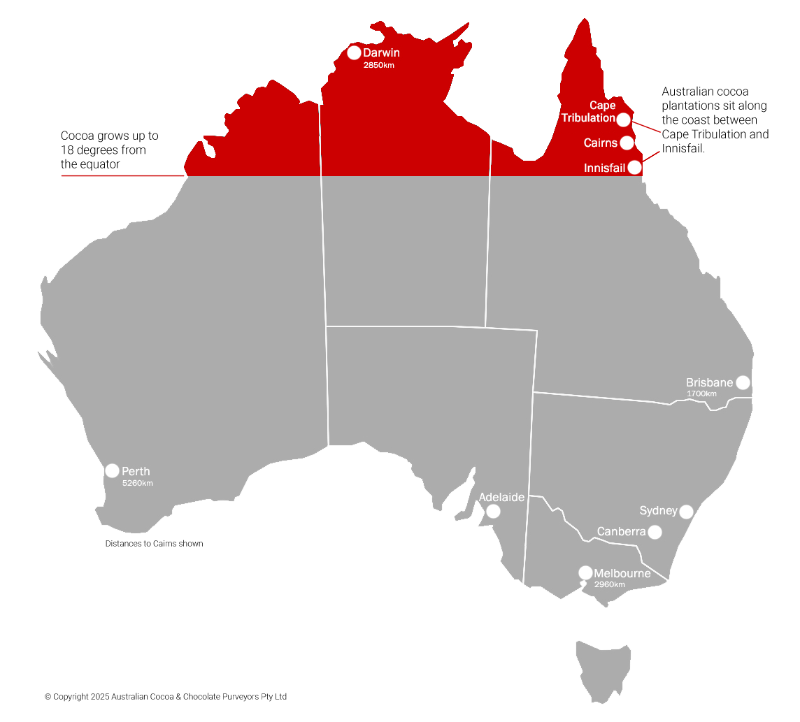 Cocoa only grows up to 18 degrees north or south of the equator which takes in the top end of Australia.
