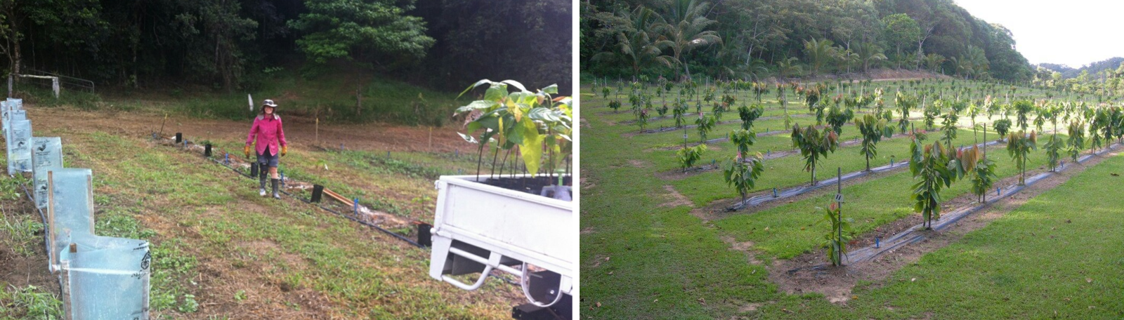 Cocoa seedlings being planted in the Atherton Tablelands, 1 year old cocoa plantation north of Mossman.